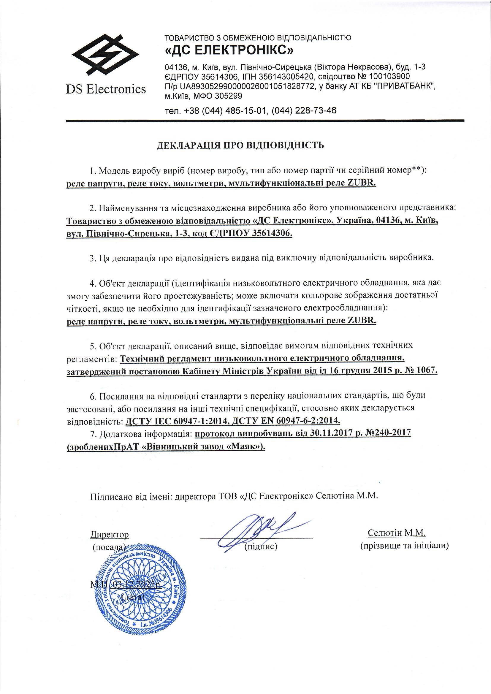 Декларація про відповідність ТР низьковольтного електричного обладнанняЗавантажити у PDF