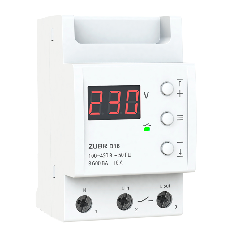 Однофазне реле напруги ZUBR D16 допомагає захистити електрообладнання від надмірних коливань напруги в мережі. Пристрій вимикає навантаження при настанні критичної ситуації. Ви можете обирати верхню межу напруги в діапазоні від 220 до 280 В і нижню — від 120 до 210 В. Реле також захищає від обриву нульового проводу на ЛЕП із потраплянням його на фазу. Модель найчастіше застосовується з контакторами (магнітний пускач, силове реле).