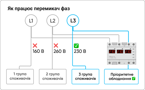 Принцип роботи перемикача фаз — пристрій постійно аналізує напругу на всіх трьох фазах (L1, L2, L3). Якщо напруга на фазі, від якої живиться пріоритетне обладнання, виходить за встановлені межі або взагалі зникає — ZUBR перемикає живлення цього обладнання на іншу стабільну фазу. І звісно ж захищає ваше обладнання від критично високої та низької напруги.