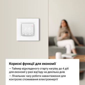 Управление устройством осуществляется с помощью трех кнопок. Цифровой экран отображает температуру и системные уведомления. Также он делает более удобной навигацию по меню настроек. Вы можете регулировать яркость экрана в режиме ожидания для уменьшения акцента на терморегулятор в помещении. Терморегулятор выполнен из наилучшего по противопожарным требованиям пластика — класс V0