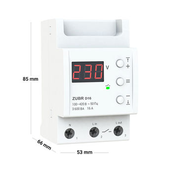 Однофазне реле напруги ZUBR D16 допомагає захистити електрообладнання від надмірних коливань напруги в мережі. Пристрій вимикає навантаження при настанні критичної ситуації. Ви можете обирати верхню межу напруги в діапазоні від 220 до 280 В і нижню — від 120 до 210 В. Реле також захищає від обриву нульового проводу на ЛЕП із потраплянням його на фазу. Модель найчастіше застосовується з контакторами (магнітний пускач, силове реле).