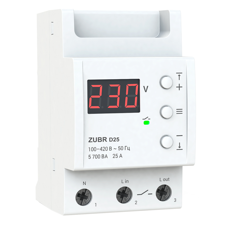 Реле напруги ZUBR D25-63 призначені для захисту обладнання від надмірних коливань напруги в мережі. При настанні аварійної ситуації реле вимикає навантаження. Застосовується в однофазних мережах змінного струму (230 В).