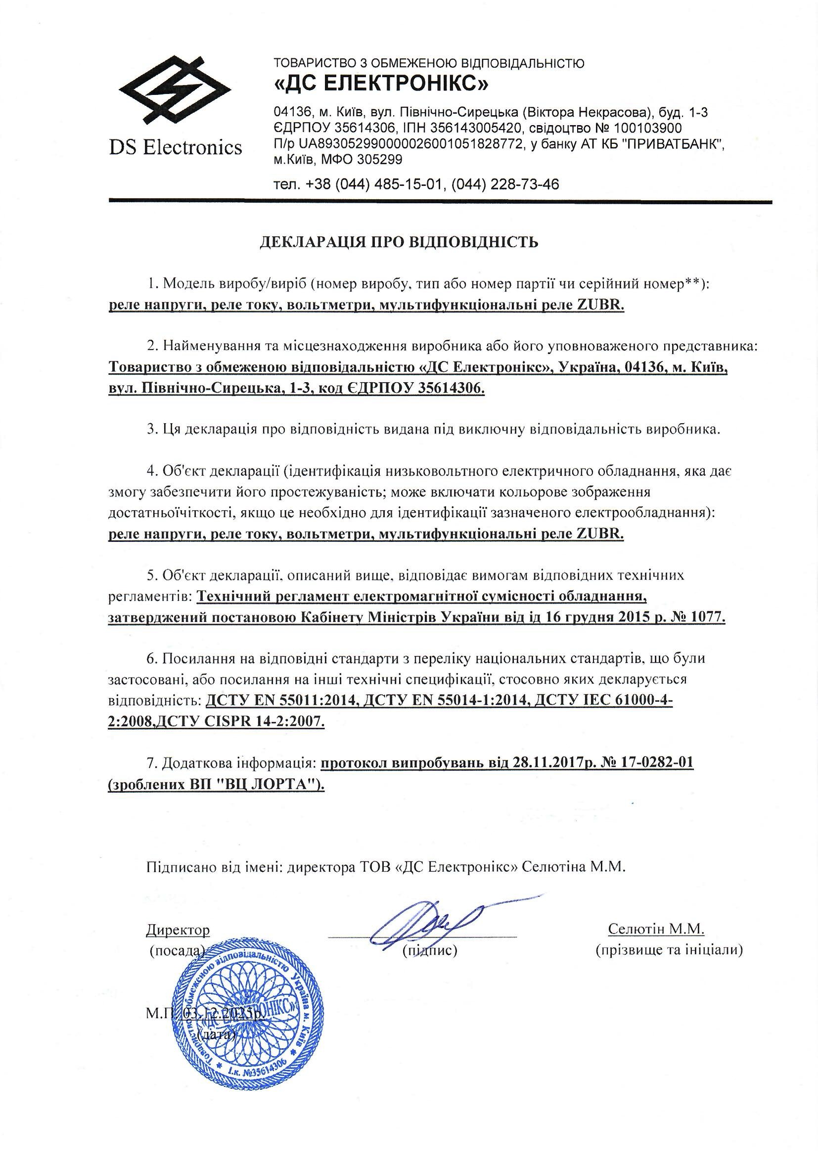 Декларация о соответствии реле напряжения ZUBR Директиве 2011/65/EUСкачать в PDF