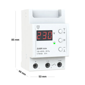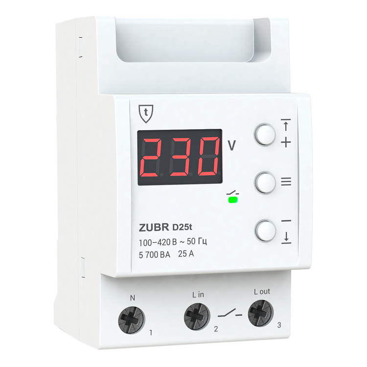Реле напряжения ZUBR D25-63 (t) предназначены для защиты оборудования от чрезмерных колебаний напряжения. При наступлении аварийной ситуации устройство отключает подачу нагрузки. Реле применяются в однофазных сетях переменного тока (230 В). Дополнительно оснащено термозащитой.