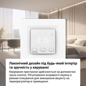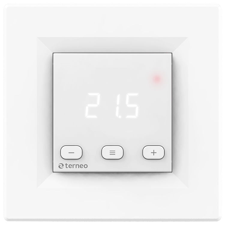 Управление устройством осуществляется с помощью трех кнопок. Цифровой экран отображает температуру и системные уведомления. Также он делает более удобной навигацию по меню настроек. Вы можете регулировать яркость экрана в режиме ожидания для уменьшения акцента на терморегулятор в помещении. Терморегулятор выполнен из наилучшего по противопожарным требованиям пластика — класс V0
